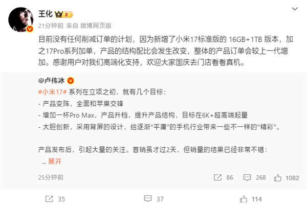 Regarding Guo Mingchi’s plan to reduce orders for the Xiaomi 17 series, Xiaomi’s general manager of public relations, Wang Hua, said: “There is currently no plan to reduce orders. Because the 16GB+1TB version of the Xiaomi 17 standard edition has been added, and the 17 Pro series has been added, the product structure ratio will change, and the overall product order will increase compared to the previous generation.”