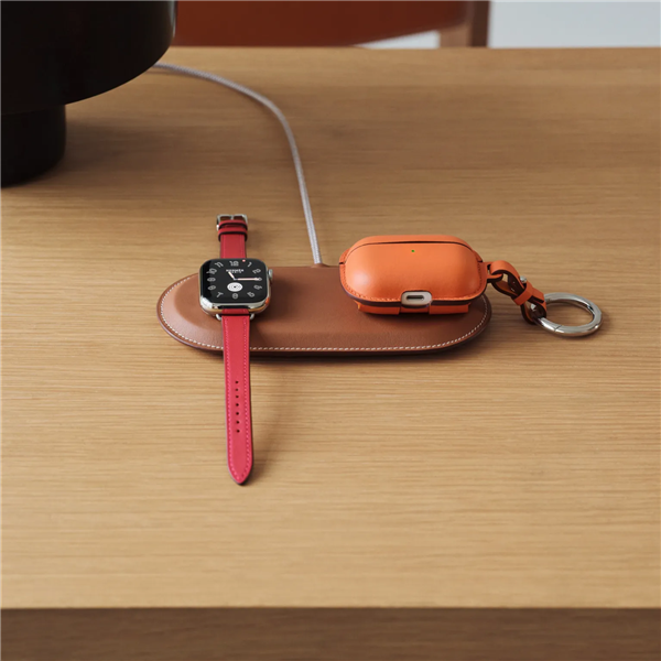 The product is meticulously wrapped in Hermès’ signature “golden Swift calfskin,” which has a delicate feel and is highly recognizable. It can charge both an iPhone and an Apple Watch at the same time.