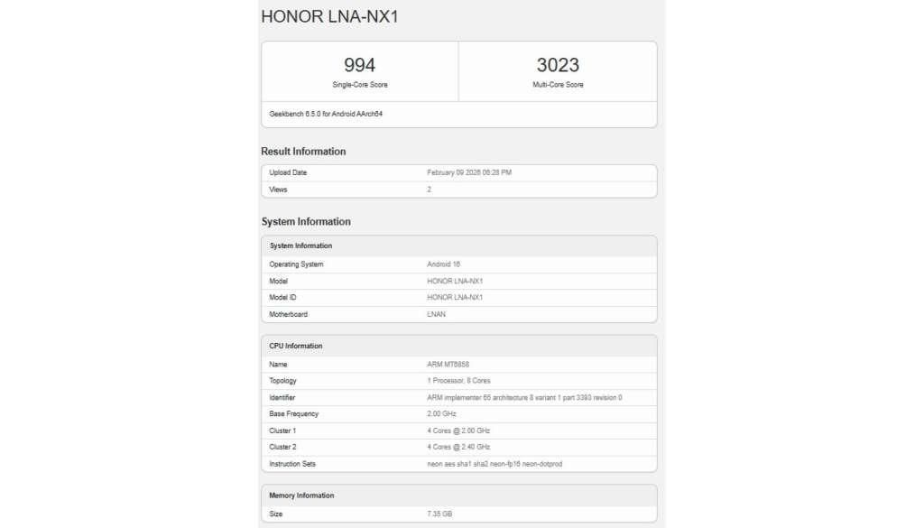 As expected, the benchmark results have uncovered the smartphone’s chipset which is identified as the MediaTek Dimensity 7100. In the prototype tested under the model number LNA-NX1, this chipset was paired with 8GB of RAM offering an early indication of the performance users can expect.