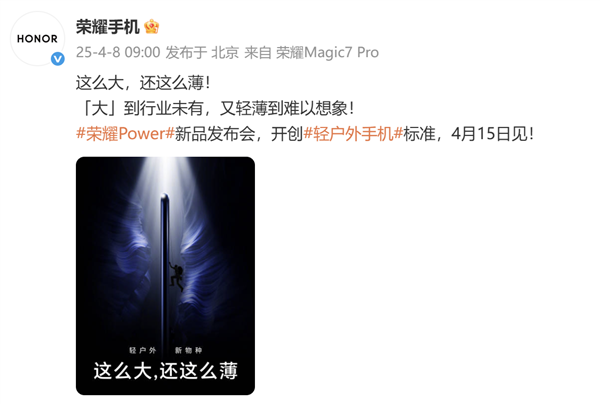 Honor Power will be officially unveiled at 19:30 on April 15. It may prove that a mobile phone can be both fashionable and light in urban life, and also carry the free soul of mountains, rivers, lakes and seas. This exploration of “a new species of light outdoor” may be the direction of future smartphone evolution.