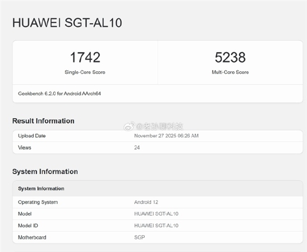 A blogger shared a set of Geekbench 6 scores for the Kirin 9030 Pro. The single-core score was 1742, and the multi-core score was 5238.