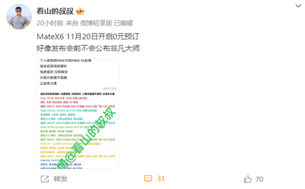 According to Huawei dealer “Uncle Kanshan”, the Mate X6 series will be available for pre-order at 0 yuan tomorrow (November 20).