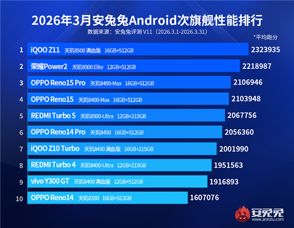 The competition in the performance rankings of mid-range flagship phones is equally fierce. The iQOO Z11, equipped with the full-fledged Dimensity 8500 processor, took first place with an average score of 2,323,935. The Honor Power2 and OPPO Reno15 Pro ranked second and third, respectively. The Dimensity 8500 series processor has become the core configuration in the mid-range flagship market, demonstrating impressive performance.