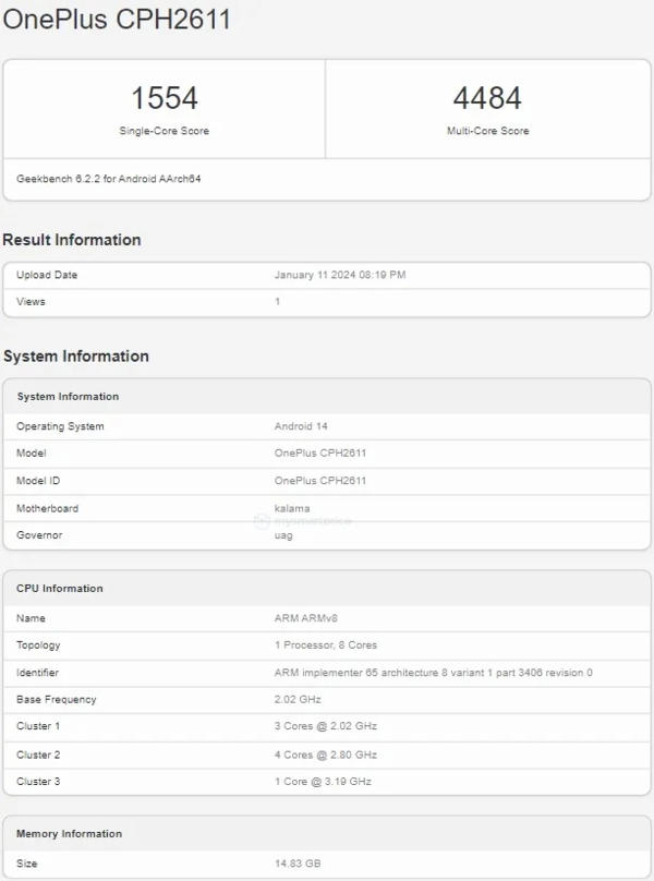 According to a report by MySmartPrice, the OnePlus 12R’s Geekbench scores have been revealed. The device, with the model number CPH2611, scored 1554 in single-core tests and 4484 in multi-core tests. These scores indicate that the phone will run on the Android 14 operating system and come equipped with 16GB of memory. The chipset, identified as “Kalama” in the scores, is likely the Qualcomm Snapdragon 8 Gen 2, as the phone’s peak frequency matches the X3 core frequency of the Snapdragon 8 Gen2 at 3.19GHz.