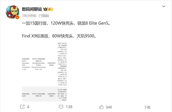 The Chinese version of OnePlus 15 obtained 3C certification, model number is PLK110, and it is the first to be equipped with Snapdragon 8 Elite Gen5 and supports 120W wired flash charging.