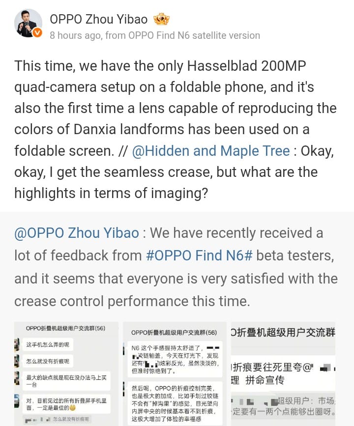 According to the same Oppo representative, the Find N6 will be the only folding smartphone equipped with a Hasselblad optimized 200MP quad camera setup, giving it a distinct position in the segment. It is also expected to become the first device in its category to integrate Oppo’s Danxia lens technology. The Weibo post further confirmed that a Find N6 Satellite Edition is currently in development adding another variant to the lineup.