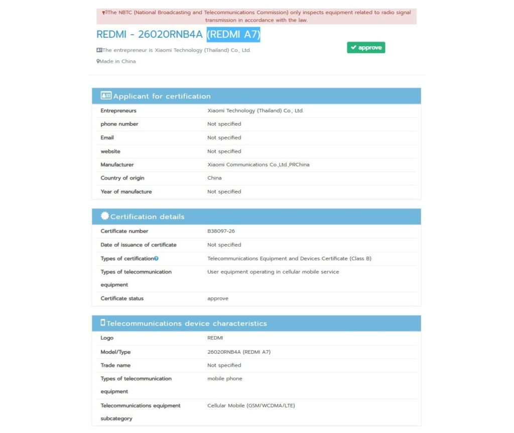Certification for the Redmi A7 Pro was granted earlier this month indicating that its official debut could be approaching. Now the standard Redmi A7 appears to be moving through regulatory channels as well and could debut alongside the Pro variant. Thailand’s NBTC database reveals the Redmi A7 under the model number 26020RNB4A pointing toward a possible joint announcement.