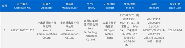 A new Xiaomi phone recently obtained 3C certification. The model is 25053RT47C and supports 90W fast charging.