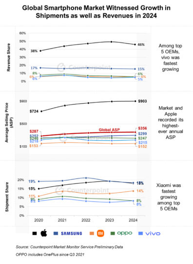 According to Counterpoint Research’s analysis of the global smartphone market in 2024, Samsung continues to solidify its position as a leader. The report highlighted that the average selling price (ASP) of Galaxy smartphones was $299—higher than its closest competitors Oppo ($247), Vivo ($215), and Xiaomi ($152). These numbers underscore Samsung’s dominance in the premium Android segment.