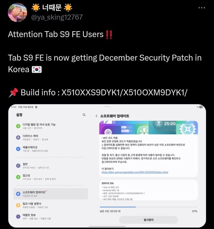 Samsung has currently started distributing the update in South Korea, which is the company’s home country. The update comes with firmware version X510XXS9DYK1 and has a file size of 331.30MB (as reported by @ya_sking12767). Samsung is expected to expand the rollout to more regions over the next few days. The December 2025 security update fixes 57 known security issues. Additional information is available here.
