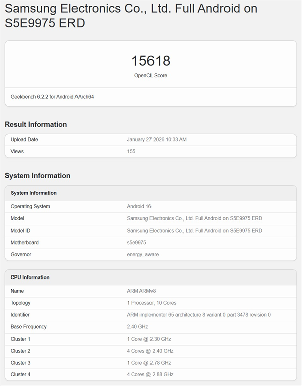 According to information published by the Geekbench benchmarking website, the Samsung Exynos 2700 features a 10-core design, with the CPU consisting of 1×2.30GHz + 4×2.40GHz + 1×2.78GHz + 4×2.88GHz , and is manufactured using Samsung’s 2nm process, making it the most powerful mobile phone chip in Samsung’s history.