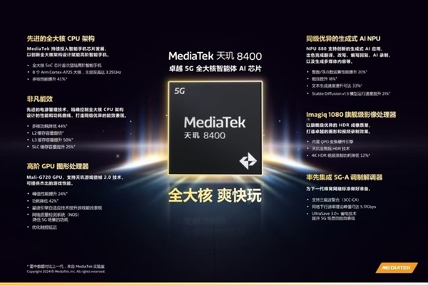 MediaTek released the new Dimensity 84005G full-core intelligent AI chip, which is equipped with many advanced technologies of the Dimensity flagship chip. It has very significant upgrades in performance, energy efficiency, imaging, generative AI and many other aspects. It is the first to empower the high-end smartphone market with innovative full-core architecture design.