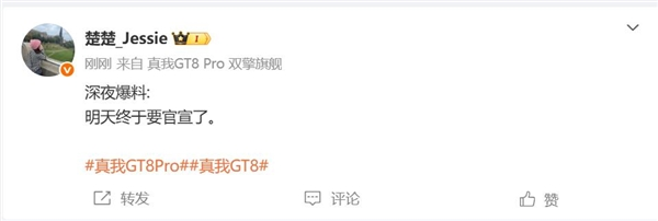 realme China CMO Chuchu_Jessie announced that the realme GT8 and realme GT8 Pro will be officially announced tomorrow.