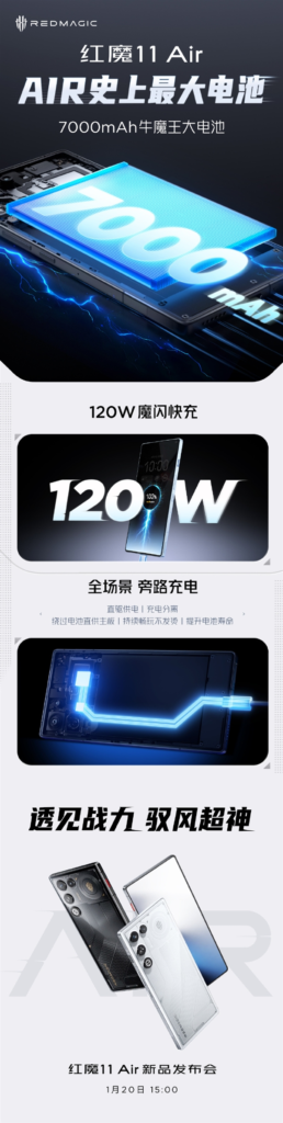 Fast Technology reported that Red Magic gaming phone announced that the Red Magic 11 Air will be equipped with a 7000mAh “Bull Demon King” battery, which is the largest battery in the history of the Air series.