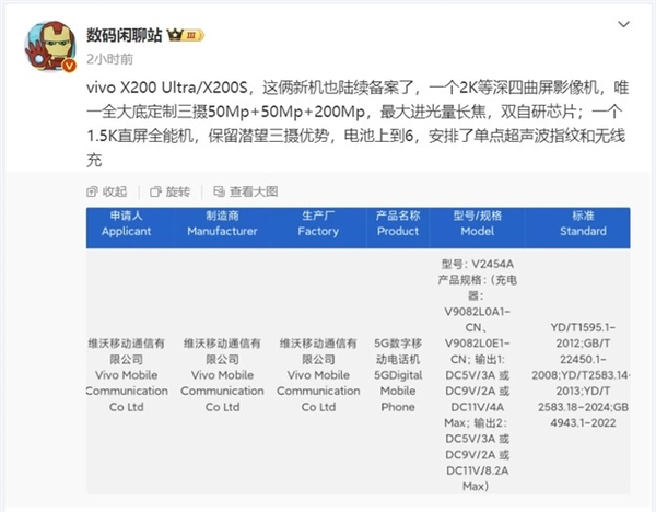 vivo plans to launch a series of new products at the end of April, including X200 Ultra, X200S, Watch5, and a high-performance tablet with a 12.95-inch screen. As early as March 14, vivoX200 Ultra and X200S had successfully passed 3C certification and completed network registration.